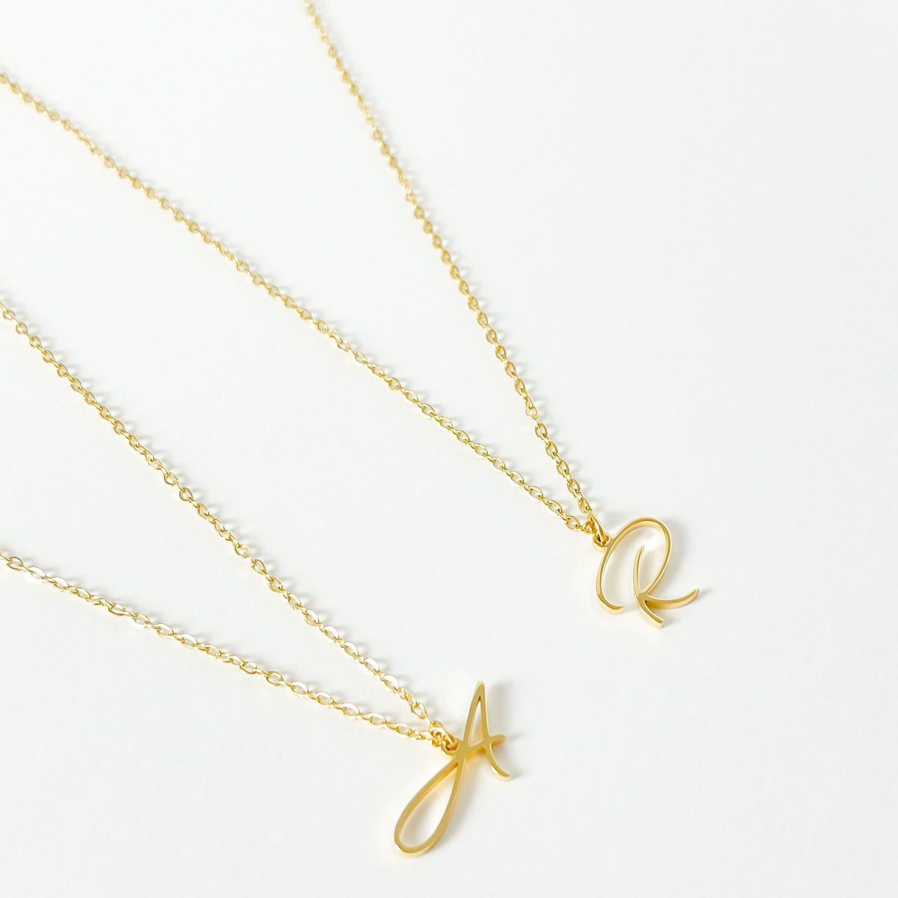 A dainty initial pendant featuring a cursive font. This necklace is your go to every day custom piece. Wear your initial or someone close to you with style.