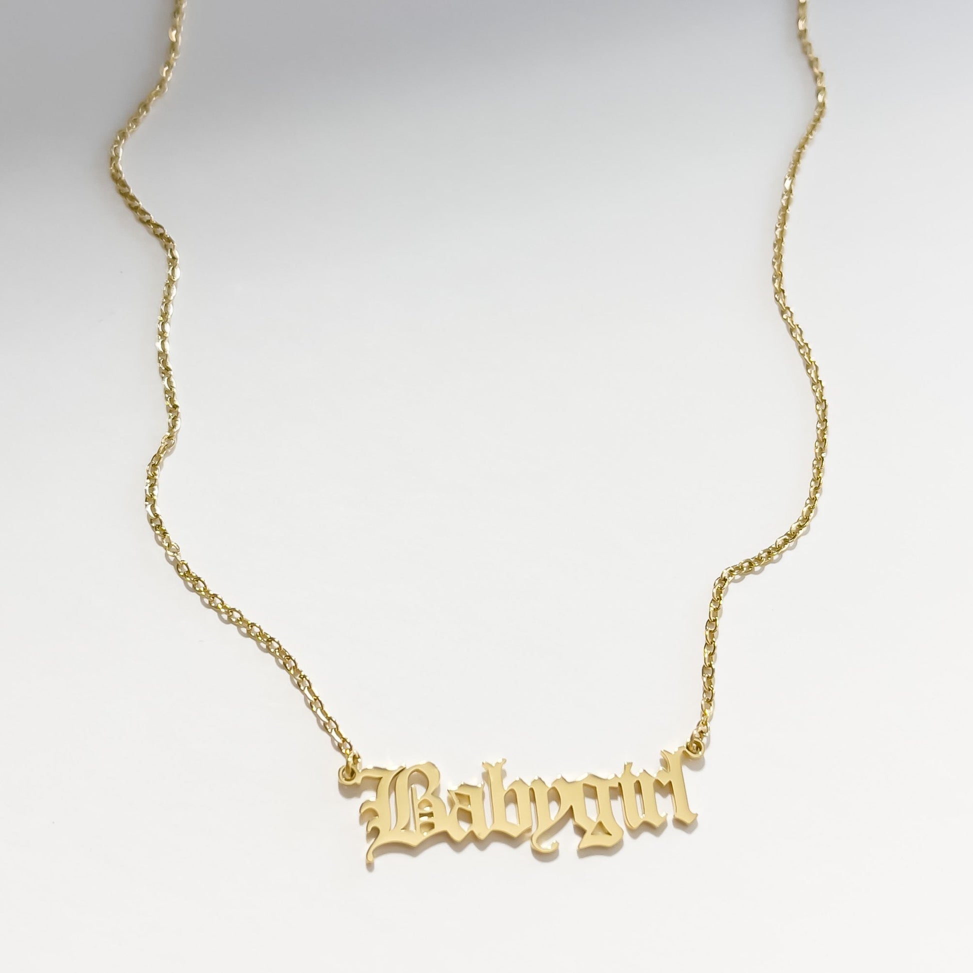For the lovers of the old english style font. Our babygirl name necklace has been crafted from high quality stainless steel for a water and tarnish resistant finish so you can wear this necklace everyday. Choose from an 18k gold coating or stainless steel.